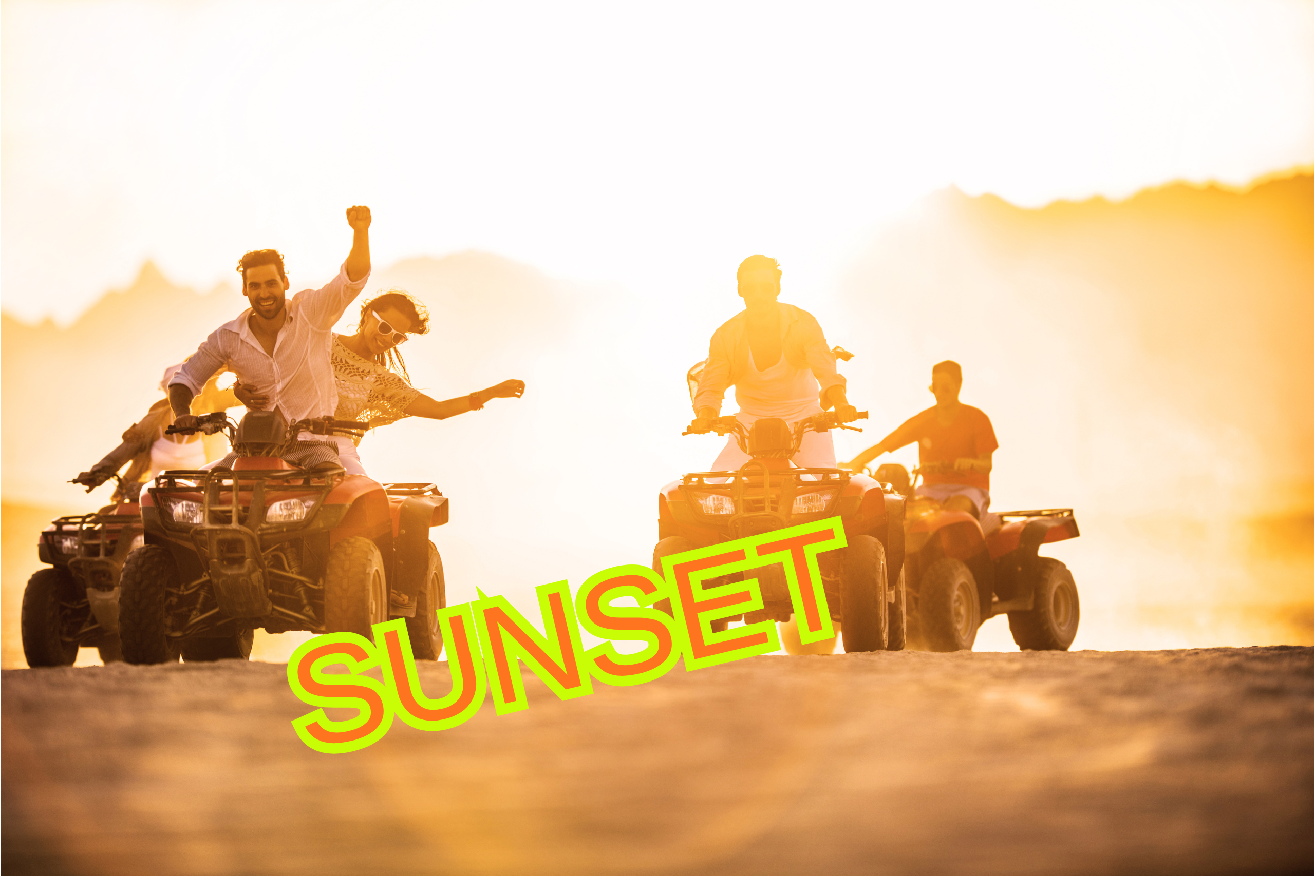 Vivez une aventure intense en quad dans le désert, portée par la magie du coucher du soleil qui embrase les dunes de lumière.